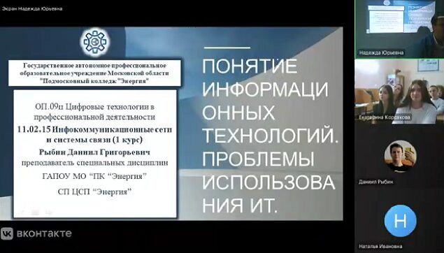 для специальности 11.02.15 Инфокоммуникационные сети и системы связи, тема занятия "Понятие информационных технологий. Проблемы использования ИТ". К занятию подключились обучающиеся и педагоги СП ЦГА и СП СЦП. Для занятия педагогом была подготовлена презентация с наглядными материалами.